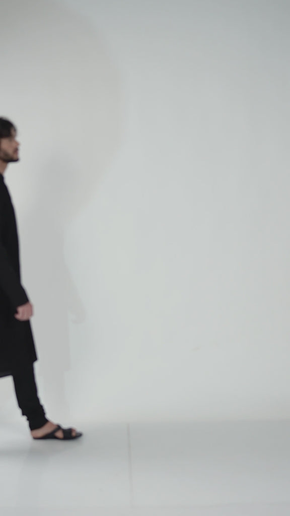 This kurta set is crafted in black chanderi silk, offering a textured look with a distinctive sheen. The front showcases a twisted pintuck pattern, adding contemporary texture to the classic silhouette. Paired with churidar pants, it makes a refined choice for festive occasions.