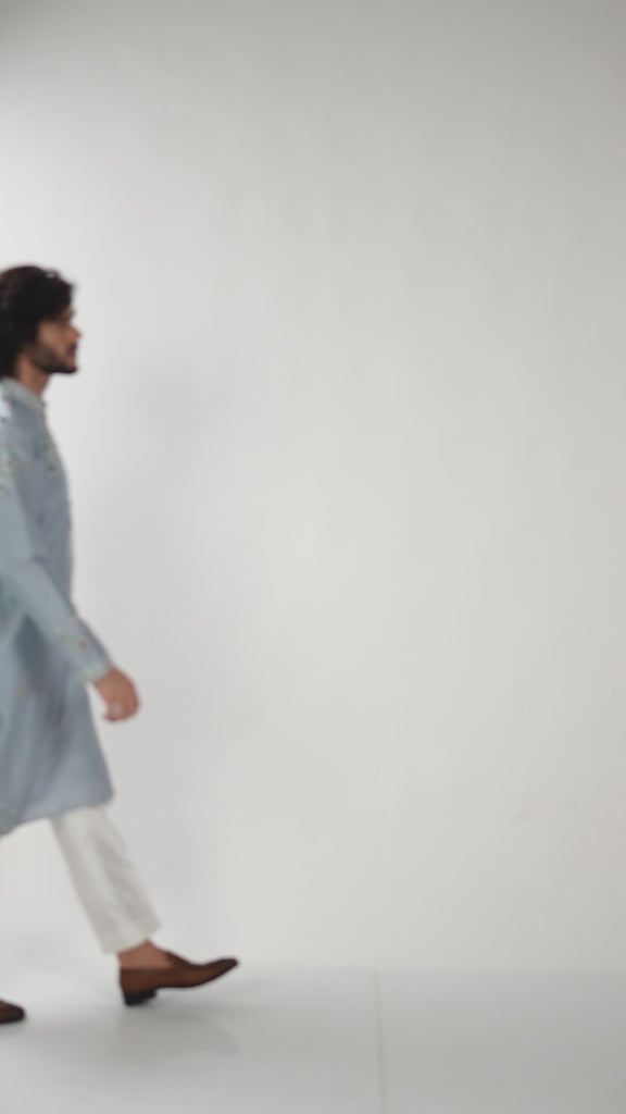This kurta set features a powder blue hue crafted from Chanderi Silk fabric, intricately embellished with delicate floral embroidery in silver and white accents. Paired with classic white trousers, the ensemble exudes charm, making it perfect for festive or formal celebrations.
