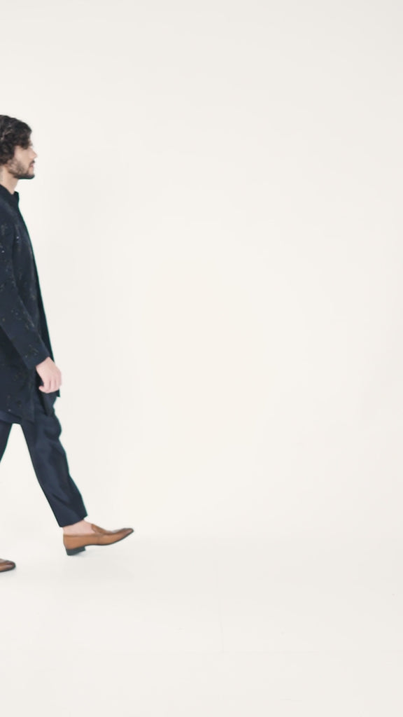 This ensemble features a navy indowestern with intricate floral embroidery and subtle cutdana embellishments, exuding refined elegance and a contemporary edge. Paired with an embroidered kurta and classic trousers, the look is sophisticated yet modern, making it ideal for formal occasions.