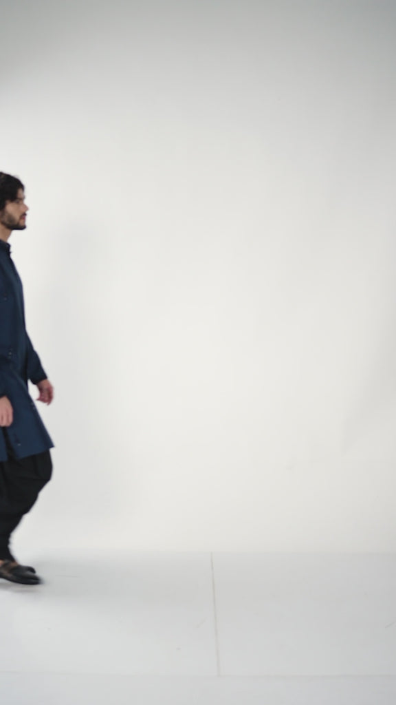This navy kurta features delicate tonal motifs with mirror work details, crafted for understated festive elegance. Paired with classic black cowl pants, it offers a refined yet versatile look ideal for contemporary celebrations and traditional events.