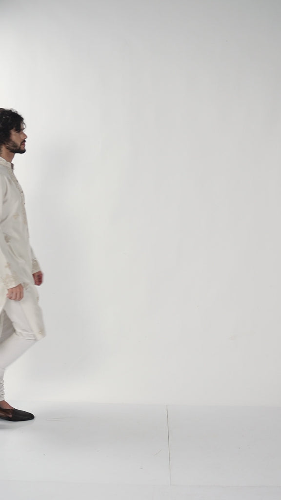 This ivory kurta set features delicate tonal embroidery along the placket, cuffs, and scattered across the body, lending a refined yet traditional appeal. Paired with matching churidar pants and two-tone loafers, the ensemble is perfect for understated festive occasions or elegant day events.