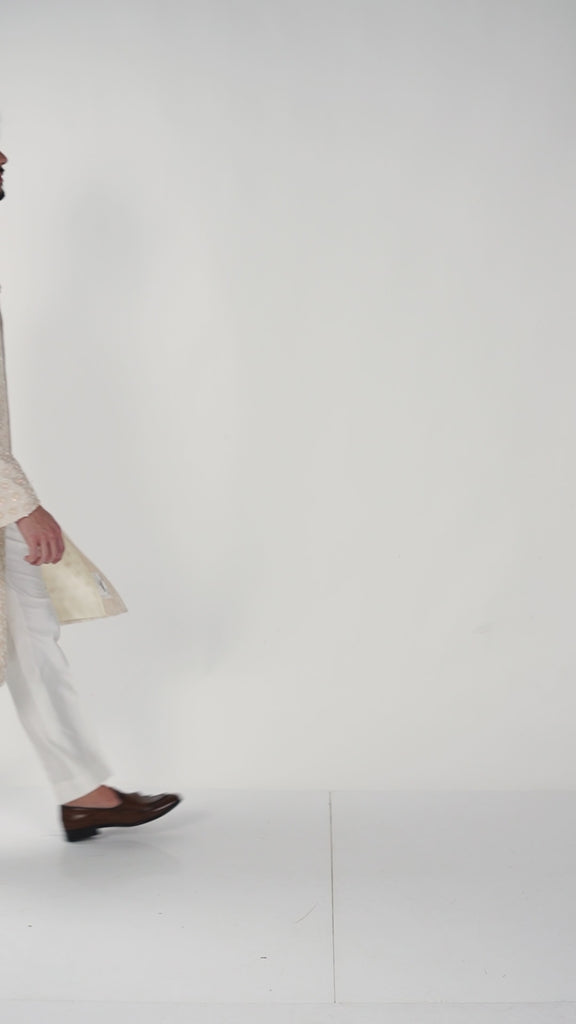 This ensemble features a beige Indo-Western intricately detailed with tonal geometric embroidery and elegant finishing touches, paired with classic ivory trousers. The cut and concealed placket offer a contemporary take on traditional formalwear.