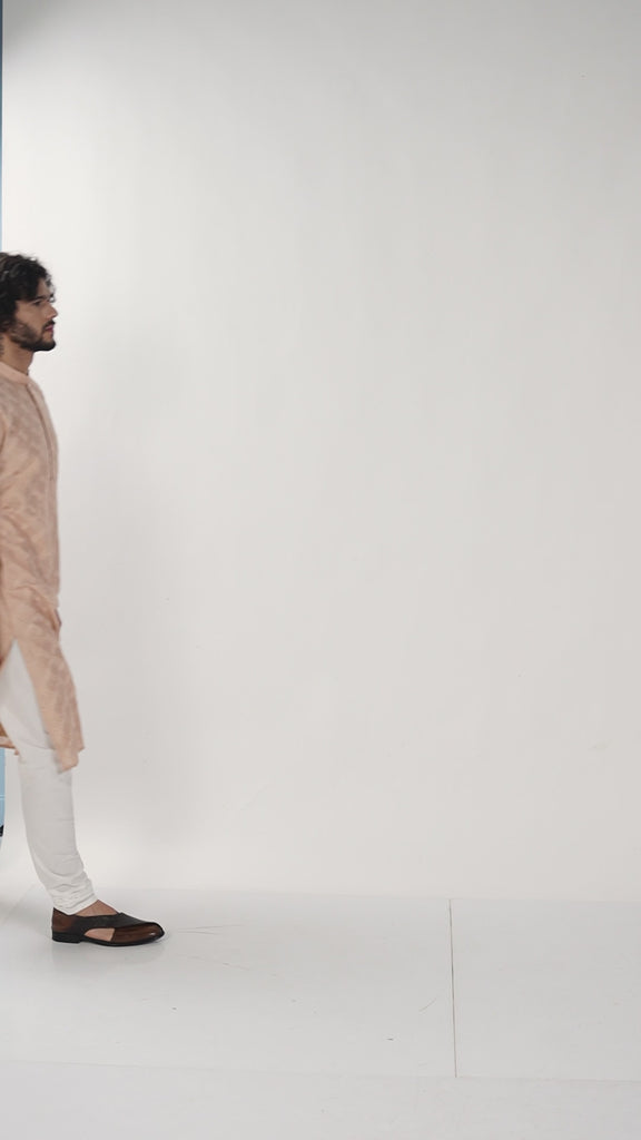 This peach kurta is tailored in a luxurious silk fabric, showcasing an understated geometric pintuck design that delivers contemporary refinement. Matched with ivory churidar pants, the look is effortlessly elegant for modern festive gatherings.