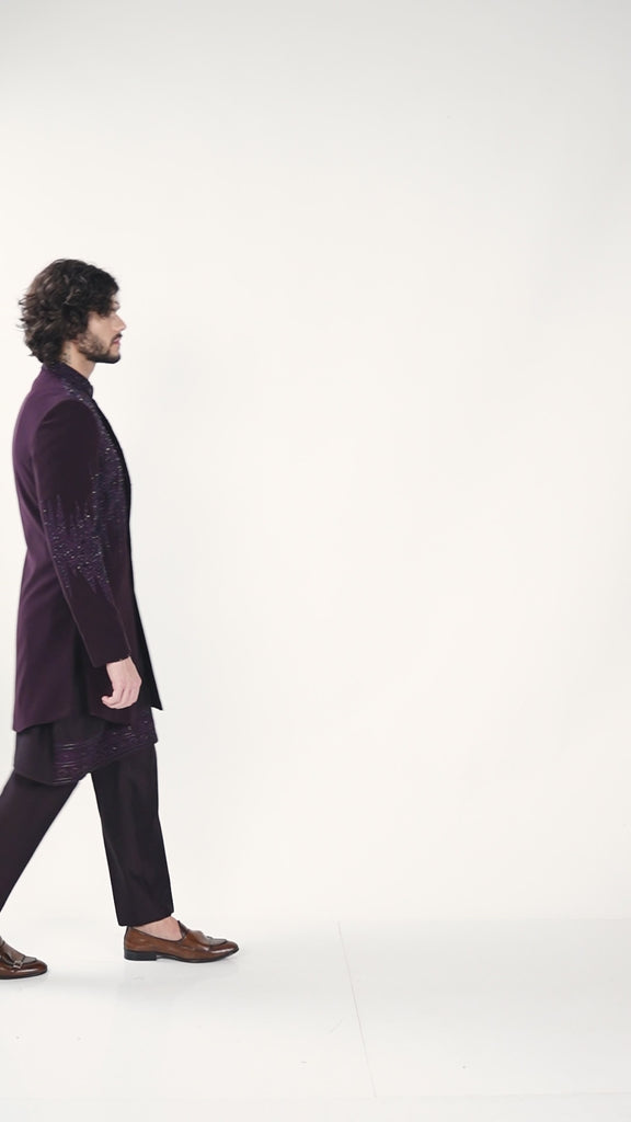 This ensemble features a wine asymmetric indowestern with striking thread and bead embroidery that cascades down from the shoulders, creating an ombré effect. The layered look with an embroidered kurta and trousers adds modern sophistication to traditional elegance.